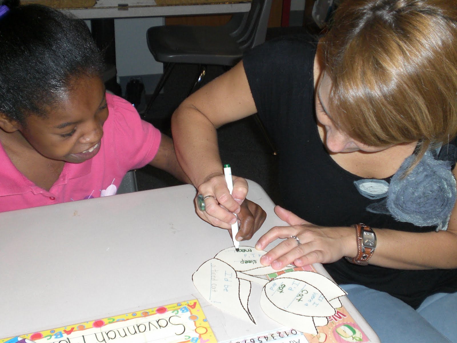 Miss Mitchell helping Savannah write her poem |